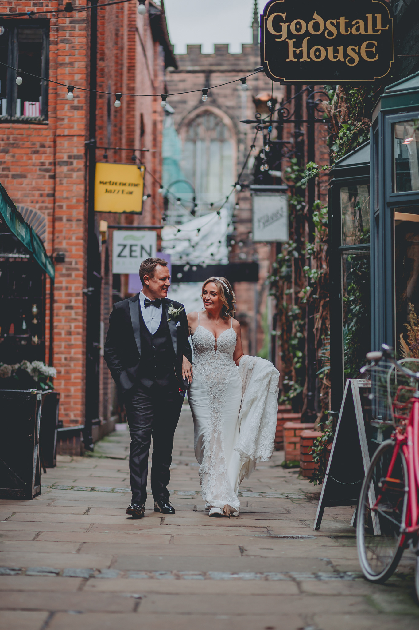The ceremony was short but very sweet, held in the 'Drawing room' which felt more like someone's living room than a wedding ceremony venue. Again, perfect for the intimacy of this wedding. I joined them for aperitifs on the landing and then it was outside for confetti. Kerry, Jonathan and I then head out around Chester for some couples portraits (with the help from lovely assistant Jo!). Jonathan proposed to Kerry underneath Chester's famous Eastgate Clock and so we took a few romantic portraits there before moving on to one of Chester's most beautiful quaint medieval streets, Godstall Lane, a favourite spot of mine! We had some laughs doing tipsy walks and hip-bumps as well as some classic fake flirting! And finally back to the Grosvenor for our final portraits (to fulfil some crazy ideas of mine...which you'll see at the end of this blog) and some more champagne and nibbles! What's not to love?!
