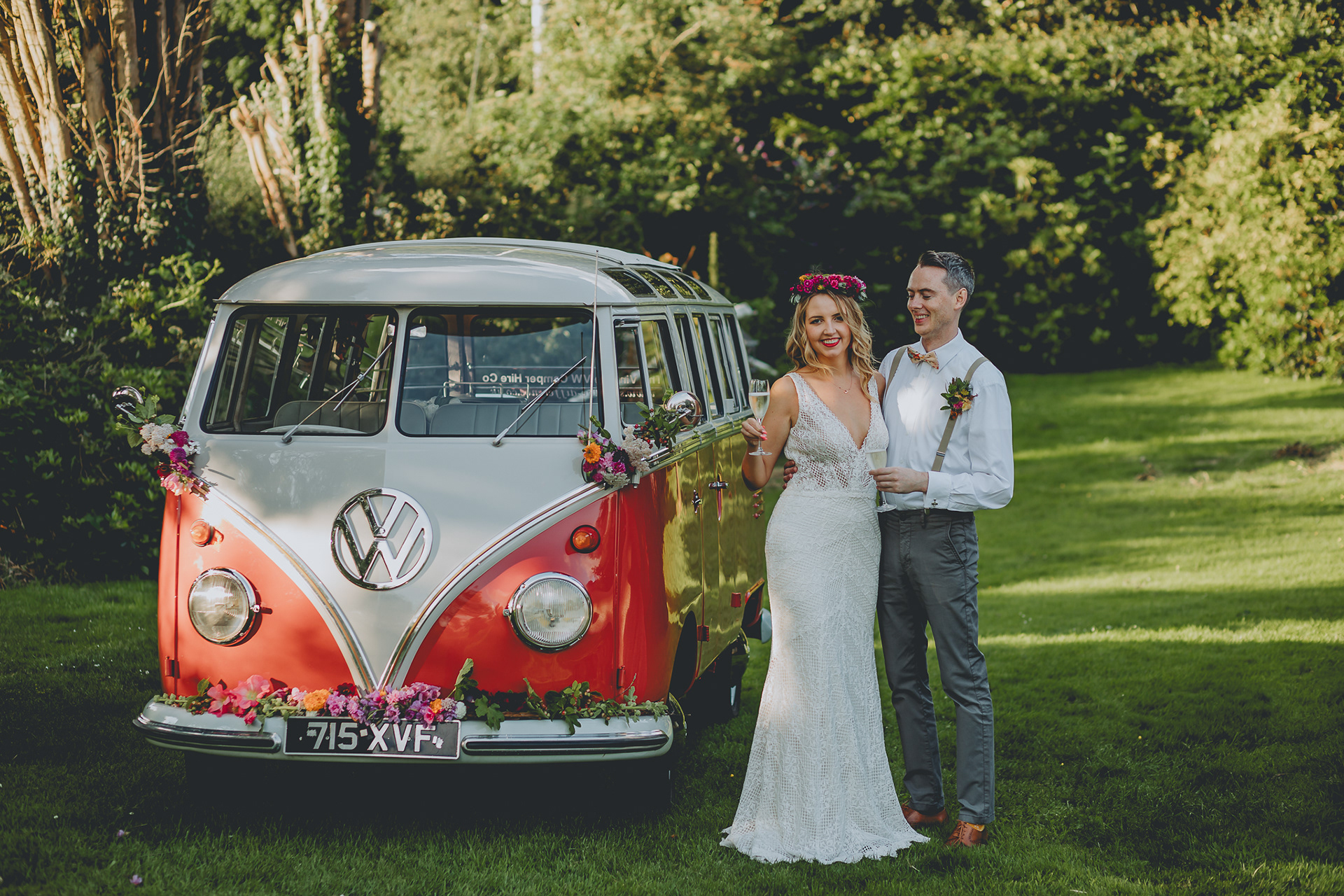 The vision: A natural, rustic wedding vibe with vibrant warm summer tones and a contemporary kitsch twist. The inspiration: Firs Flower Farm, Helsby. The story: I found Imogen on Instagram, her flowers kept grabbing my attention. Such stunningly handsome bunches in fabulous rich colours I couldn't help but share her stories which then lead to one of my couples booking her for their wedding. We got chatting and decided to get together for a bit of a collab. I took some photos at her beautiful farm on Helsby Hill and one thing lead to another...all of a sudden we were in the throws of planning a styled shoot! We reached out to some local suppliers we already had connections with and each and every one was keen to jump on board! I had been wanting to do a styled shoot for a while but hadn't found one that really resonated with me, so to plan one of my own was just a dream. I also had my heart set on a 'real' couple as opposed to a model couple, to keep it as natural and unposed as possible, giving the impression of a real wedding rather than a styled shoot. I put out a post on Facebook and the lovely Ewa responded. She and her fiancee Anton were perfect. The best thing of all, I didn't need to 'direct' them or give them any 'prompts' they were just naturals! All of the suppliers involved were on the same page from the word go and fit the bill perfectly. The boho dress and floral veil, the whimsical bouquets and flower crown, the natural hair, the funky stationery, the kitsch cake, the retro VW camper, the vibrant tones!! I am in love with the results!