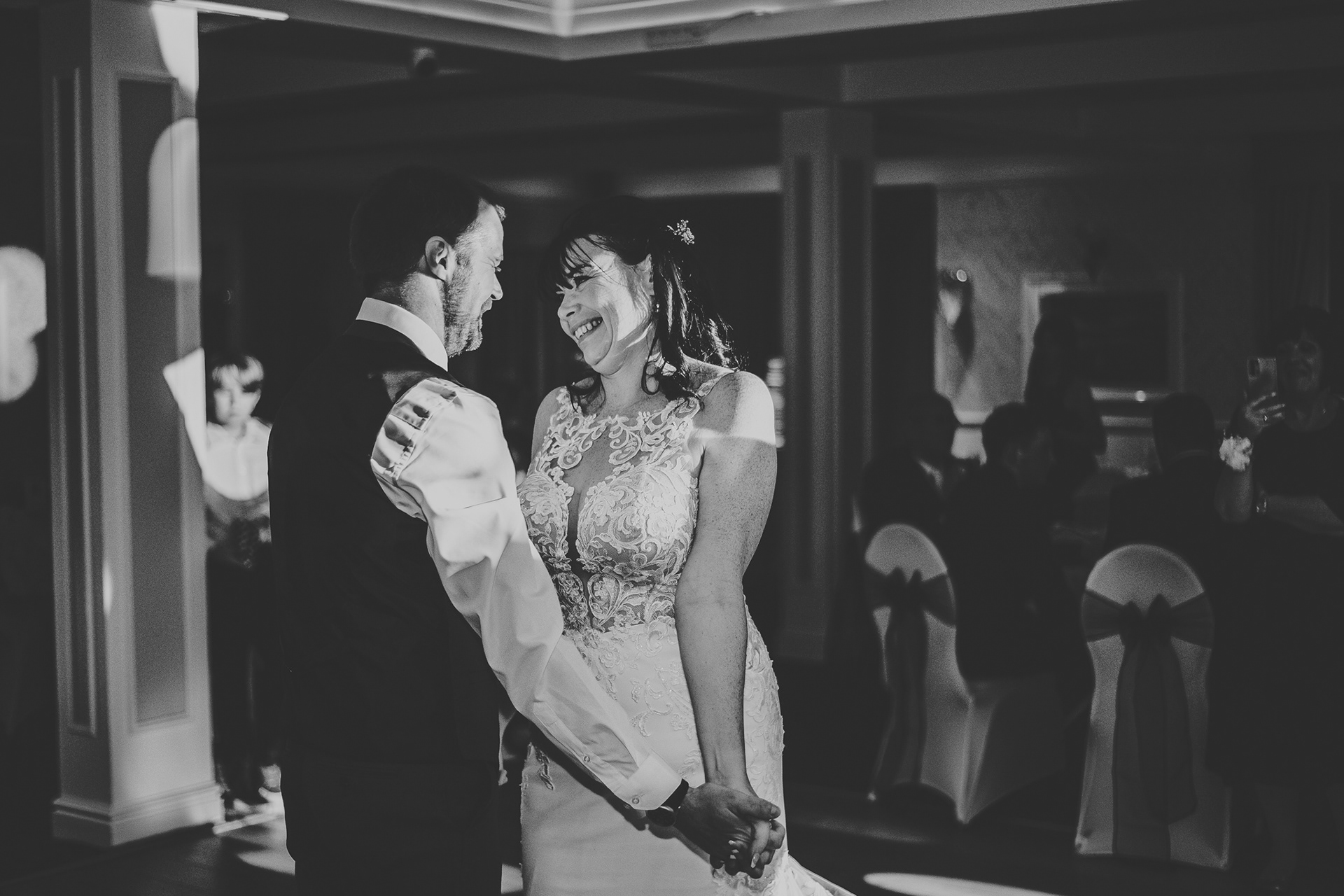 Carmel and Stephen tied the knot at Plas Maenan and what a place! The views of the Welsh valleys are breathtaking, even in the rain. It rained all day from start to finish but I wouldn't have changed this day for the world. They were a lovely bunch of people and I'll never forget how lovely and polite the kids were! Luckily the interior at Plas Maenan is equally stunning and offers the perfect backdrop for your wedding photos. We got creative with couples portraits and I asked Carmel and Stephen to rehearse their first dance in the awe-inspiring bridal suite. It was a beautiful intimate moment and I felt honoured to be there to capture it.