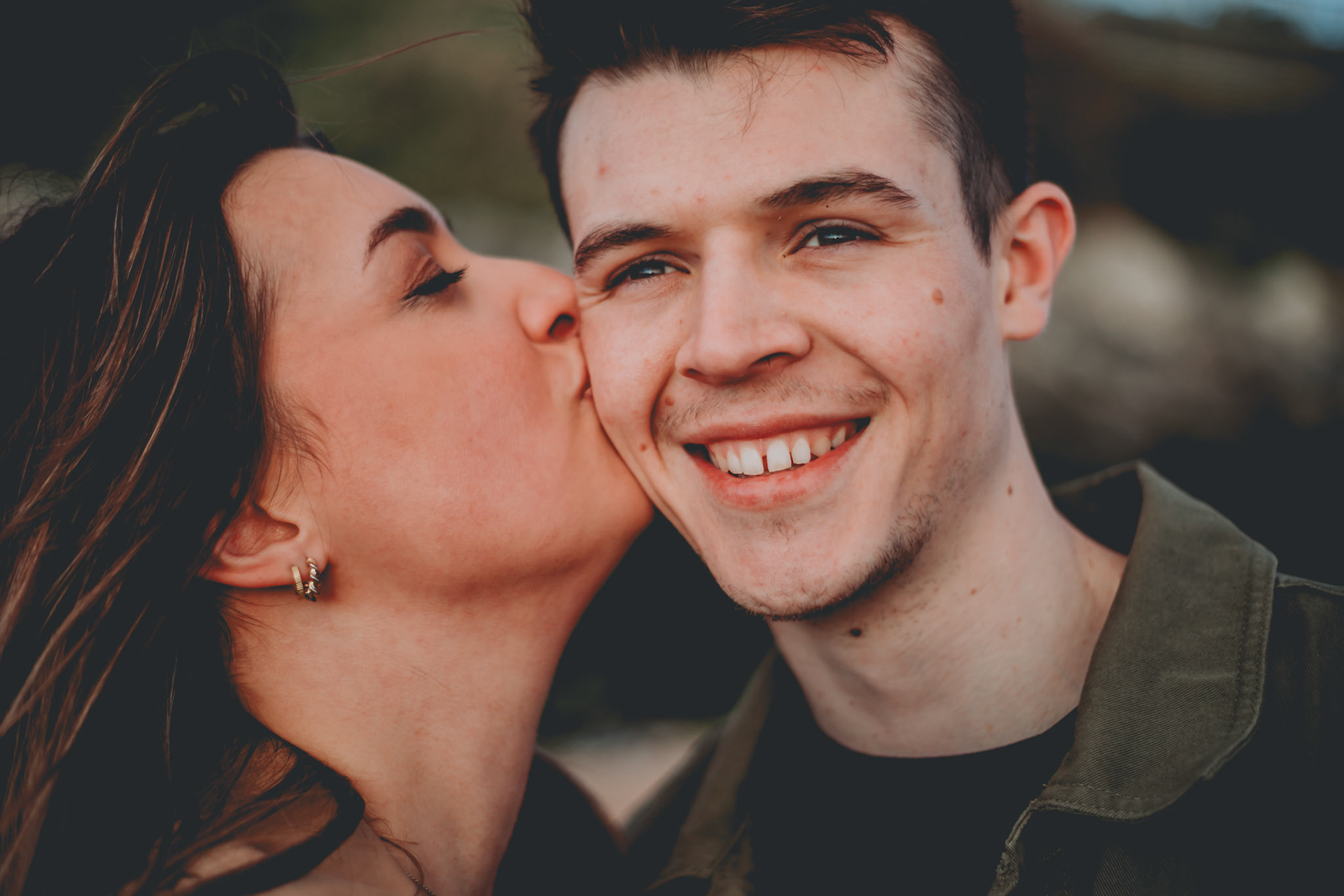 The couple had brought along their 9 month old puppy, Gus. So we took a stroll along the beach as they would normally when taking Gus for a walk. It was super relaxed as if we were friends meeting for an evening walk. Stopping for photos now and again, having some laughs, feeding Gus treats. I like to start my sessions with a walk and a talk to loosen up my couples and get them simply interacting with each other. They often laugh at the ridiculousness of the situation or take the Mickey out of each other. A laugh whether it's awkward or not is still a laugh and makes for great natural portraits! I like to keep things moving so my couples are not stiff and wondering how to stand, what to do with their hands etc. (having a dog is a great ice-braker!). So we may try some dancing, piggy backs or tipsy walks to up the energy and encourage some laughs. It's only really once we've warmed up a bit I might try some more static poses. When I say 'poses' I don't mean I will place you into a position and ask you to hold it, I simply may ask you to stand or sit and connect with each other in some way, whether it be hugging, kissing, holding hands or resting your head on your partners chest for example. My aim is to relax you as much as possible and capture the most authentic you. I think if I were to offer no direction at all most couples would freeze or be unsure what to do and therefore look more awkward or false in their photos. By offering gentle direction and then adding prompts to encourage emotion or laughter your photos are bound to feel more authentic and natural.